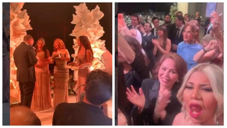 وظهرت إلهام شاهين وبوسي شلبي وهن تطلقان “زغروطة” في حفل خطوبة نجل عمرو أديب ولميس الحديدي.