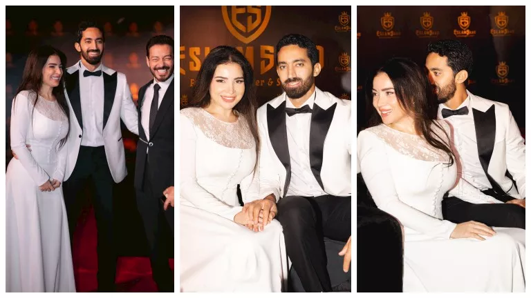 ظهرت مي عز الدين في الصور بفستان أبيض أنيق وسط أجواء رومانسية، كما حضر الفعالية عدد من نجوم الفن هم الفنان أحمد زاهر، الفنان رامي صبري، الفنان حمادة هلال والتقطوا مع مي عز الدين وزوجها العديد من الصور التذكارية.