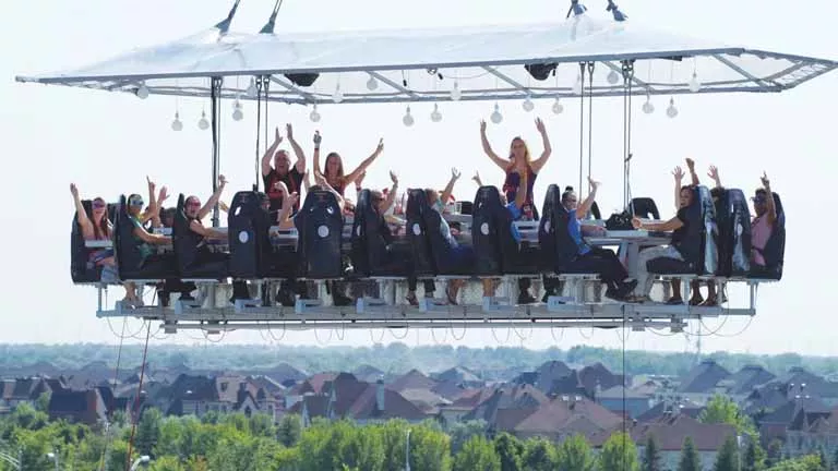 ويمكن للطاولة المعلقة أن تستوعب حتى 22 شخصًا في وقت واحد، مع رؤية بانورامية بزاوية 360 درجة للمعرض، بينما يقدم الشيف أطباقه مباشرة للزبائن المعلقة في السماء، وفقا ctvnews.
