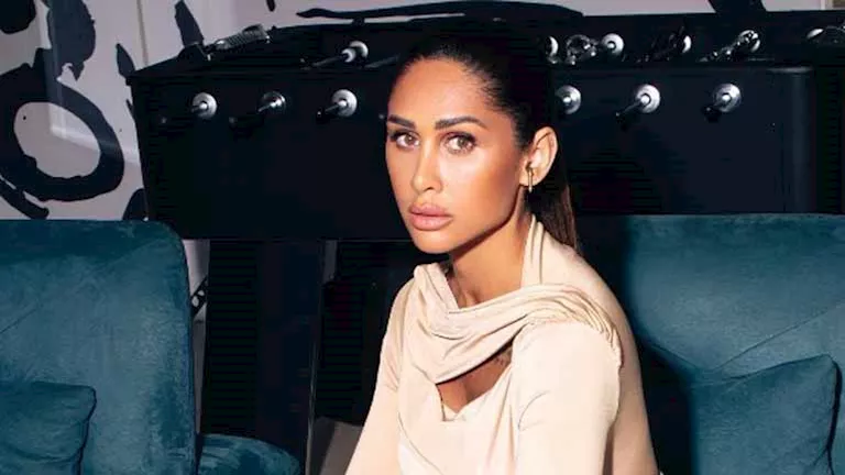 ظهرت إنجي مرتدية كروب توب مكون من قطعتين باللون الأبيض من دار الأزياء الفاخرة “Levorchy”.