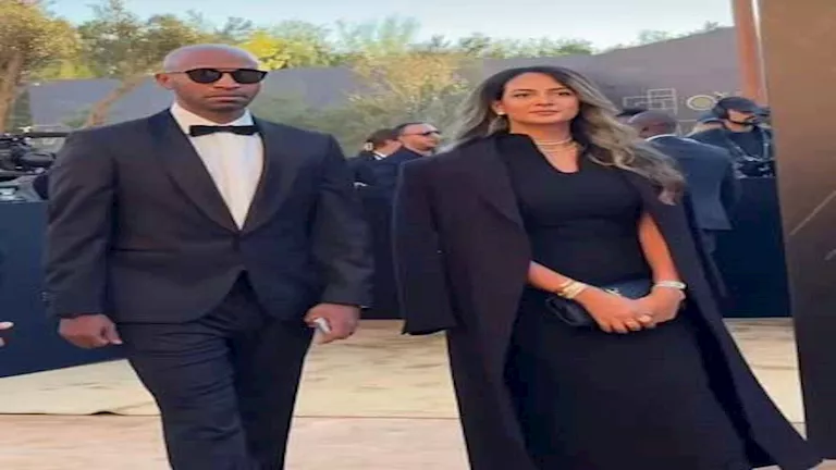 أما زوجته سارة، تألقت بفستان طويل أسود بقصة انسيابية، ونسقت معه بالطو طويل بنفس اللون، واعتمدت مكياجا ناعما بدرجات النيود، مع شعر منسدل على الجانبين بشكل بسيط.