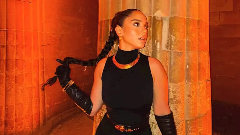 كما أنها التقطت الصور وسط أعمدة أثرية ضخمة مضاءة بأضواء برتقالية دافئة، ما أضفى طابعا دراميا وساحرا على الجلسة التصويرية.