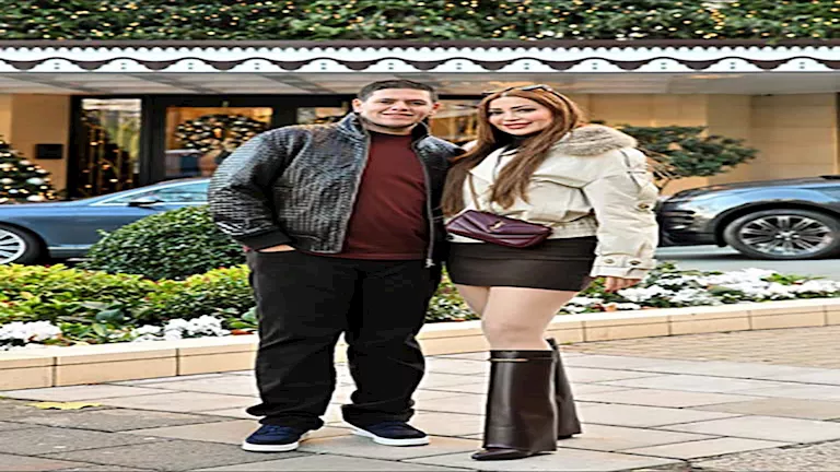 بينما ارتدى زوجها بلوفر باللون “البورجندي” ونسق معه بنطلون أسود وجاكيت مزيج من اللونين الأسود والأبيض، بالإضافة إلى حذاء أسود.