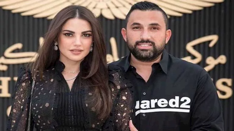 بينما ارتدى زوجها بدلة أنيقة باللون الأسود، ونسق أسفلها قميص ورابطة وحذاء عنق بنفس اللون.