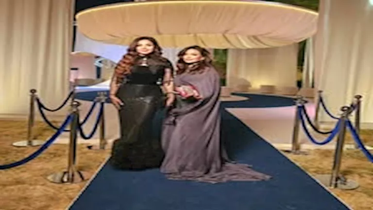 أطلت الإعلامية السعودية لجين عمران بفستان طويل باللون الأسود اللامع ومزينا بالكامل بالتطريزات، واعتمدت مكياجا قويا، وتركت شعرها منسدلا.