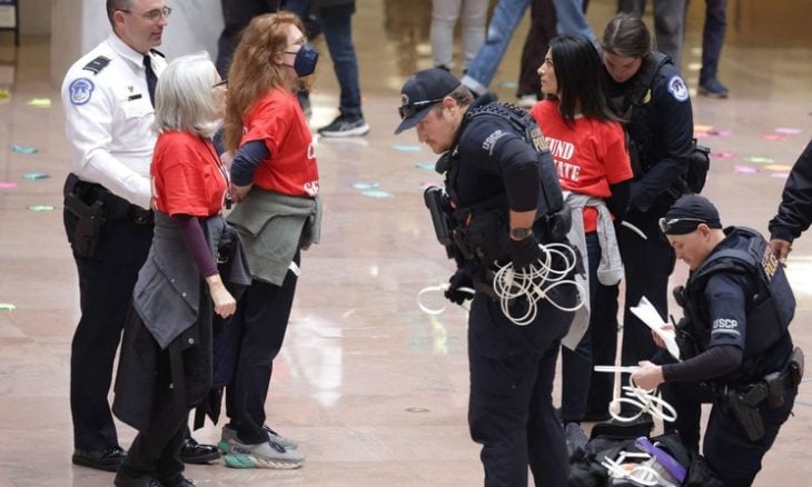 ذكرت تقارير أن 44 شخصا على الأقل اعتقلوا في مبنى الكونغرس الأمريكي في واشنطن العاصمة يوم الثلاثاء، للاحتجاج على تواطؤ الحكومة في الهجوم الإسرائيلي على قطاع غزة، في الوقت الذي يستعد فيه الكونغرس للتصويت على مشاريع قوانين مهمة هذا الأسبوع.