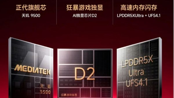يعمل الهاتف من الداخل بمعالج MediaTek Dimensity 9500، مقترنًا بشريحة رسومات منفصلة تركز على الذكاء الاصطناعي تسمى D2.