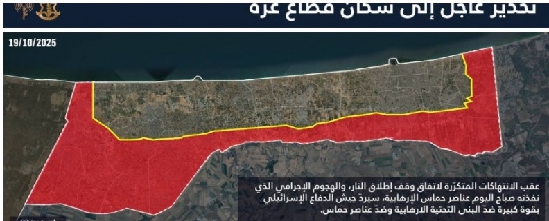 نشر المتحدت باسم الجيش الاسرائيلي خريطة تطالب الفلسطينيين بالبقاء في المناطق ماوصفه غرب الخط الاصفر وهو الخط الذي انسحب عنده جنود الاحتلال ضمن خطت ترامب.