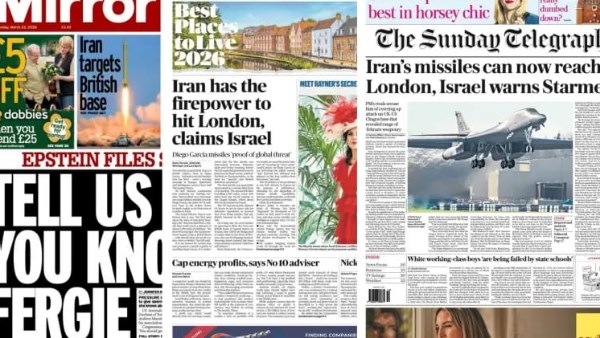 حتى صحيفة صنداي ميرور، التي ركزت أغلب صفحتها الأولى على الفضائح الداخلية والعائلة المالكة، خصصت مساحة لافتة للتهديد الإيراني، مع صورة لصاروخ باليستي في السماء وعنوان بارز: “إيران تستهدف قاعدة بريطانية”.