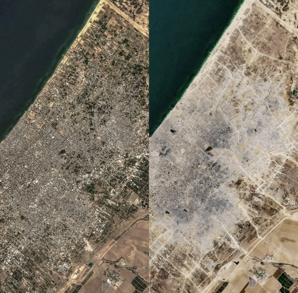 أظهرت صورتان التقطتهما الأقمار الصناعية مشاهد لمدينة غزة يوم 27 سبتمبر (أيلول) 2023، أي قبل أسابيع قليلة من شنّ حركة «حماس» هجومهاً المفاجئ على إسرائيل، ورداً على ذلك شنّت إسرائيل حربها على غزة، التي أسفرت عن مقتل أكثر من 66 ألف شخص، ونزوح الملايين، وتدمير القطاع الفلسطيني.