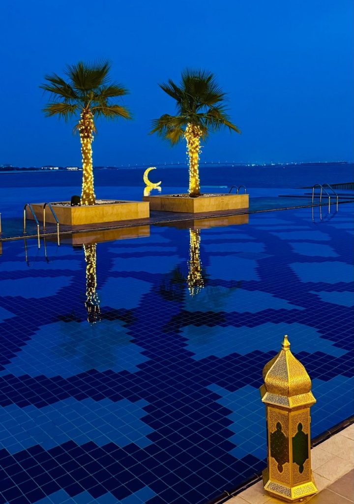ويقدّم الفندق بوفيهاً فاخراً على ضفاف البحر والمسابح المحيطة به , ويضم مجموعة متنوعة من الأطباق العربية والعالمية المحضّرة بعناية لتلبي جميع الأذواق، مع ركن خاص للحلويات الشرقية والمشروبات الرمضانية التقليدية. وتكتمل الأجواء الرمضانية مع عزف العود وأنغام الموسيقى الشرقية الحية التي تضفي لمسة من السحر والدفء على الأمسية الرمضانية من وقت الافطار حتى السحور .