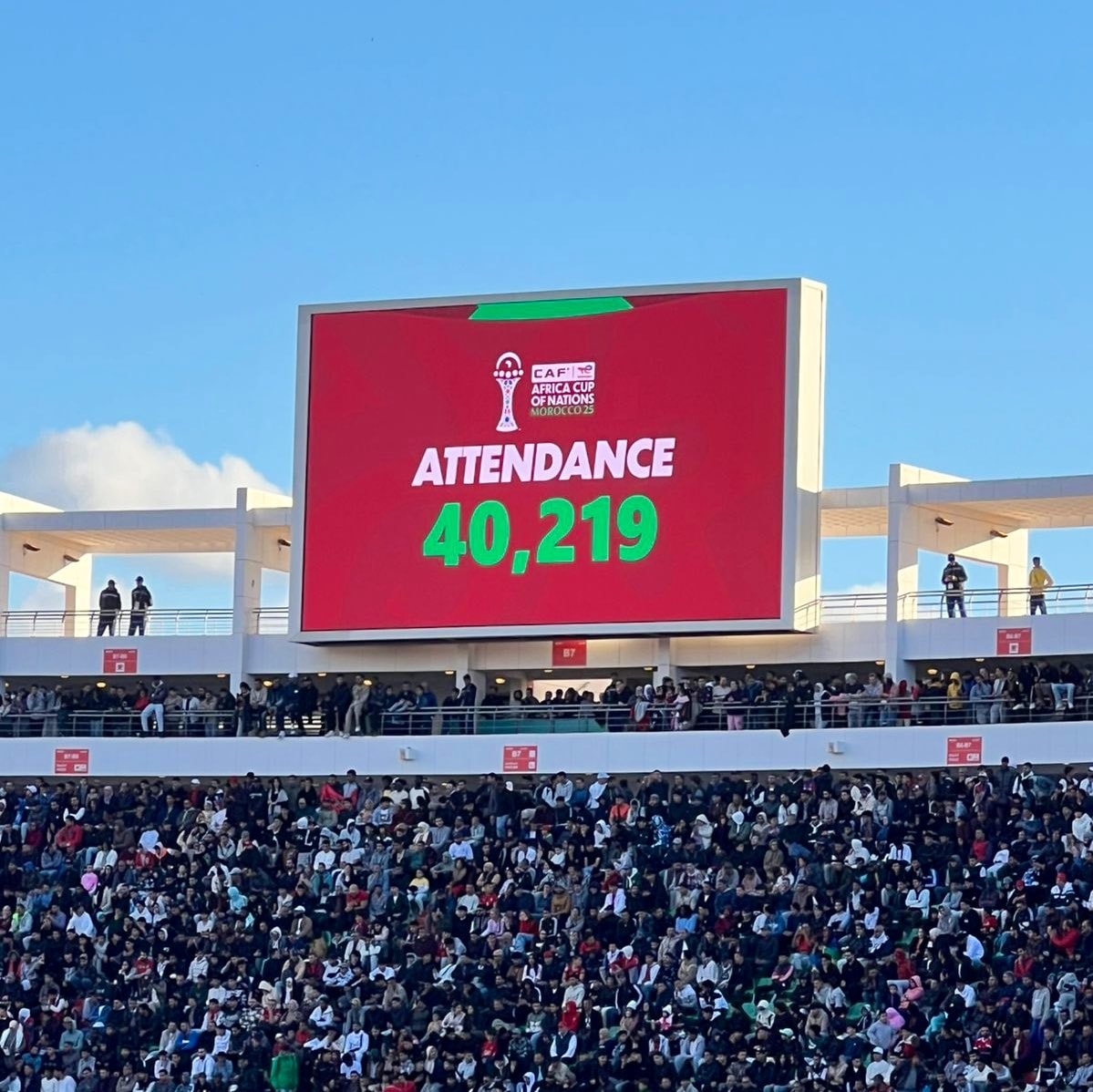 شهدت مواجهة منتخب مصر ومنتخب جنوب إفريقيا التي حسمها الفراعنة بنتيجة 10 وحسم التأهل لدور الـ 16 من بطولة كأس الأمم الأفريقية، حضورا جماهيريا كبيرا، بإجمالي 40219 مشجعا، في المباراة التي جمعت المنتخبين على ملعب أدرار بمدينة أغادير المغربية في الجولة الثانية بالمجموعة الثانية في النسخة رقم 35 لكأس الأمم الإفريقية.
