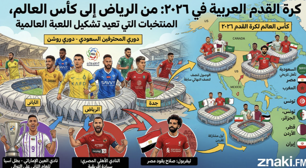 يمثل موسم 2025–2026 فصلًا جديدًا في تاريخ كرة القدم العربية. فقد بلغ الحضور العربي في كأس العالم 2026 رقمًا قياسيًا بوصول ثماني دول عربية إلى النهائيات. وعلى مستوى الأندية، فاز الهلال على مانشستر سيتي 4–3 وتعادل مع ريال مدريد 1–1 في كأس العالم للأندية 2025، بينما تُوِّج الأهلي السعودي بدوري أبطال آسيا للنخبة، وواجه العين الإماراتي يوفنتوس ومانشستر سيتي في الولايات المتحدة. أما الدوري السعودي، الذي وُصف سابقًا بأنه محطة أخيرة للنجوم الأوروبيين، فأصبح دوريًا شديد التنافس وله تأثير قاري واضح. وبالنسبة للجمهور العربي الذي يتابع الأندية واللاعبين والبطولات، تقدم النسخة العربية من Znaki.FM مرجعًا متجددًا يغطي المشهد الرياضي العربي وأبرز الأسماء المرتبطة به.