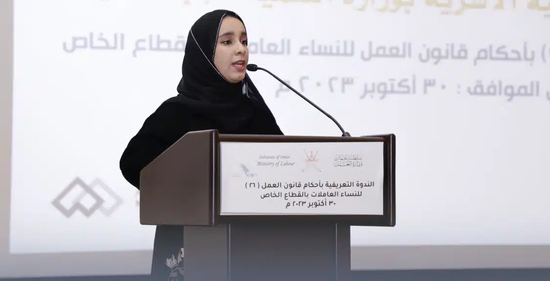 نظمت ⁧‫وزارة العمل‬⁩ ممثلة بالمديرية العامة للرعاية العمالية ( دائرة التوعية العمالية) ندوة تعريفية بأحكام قانون العمل للنساء العاملات بمنشآت القطاع الخاص تحت رعاية السيدة معاني بنت عبدالله البوسعيدي المديرة العامة للتنمية الأسرية ورئيسة لجنة حماية الطفل بوزارة التنمية الاجتماعية