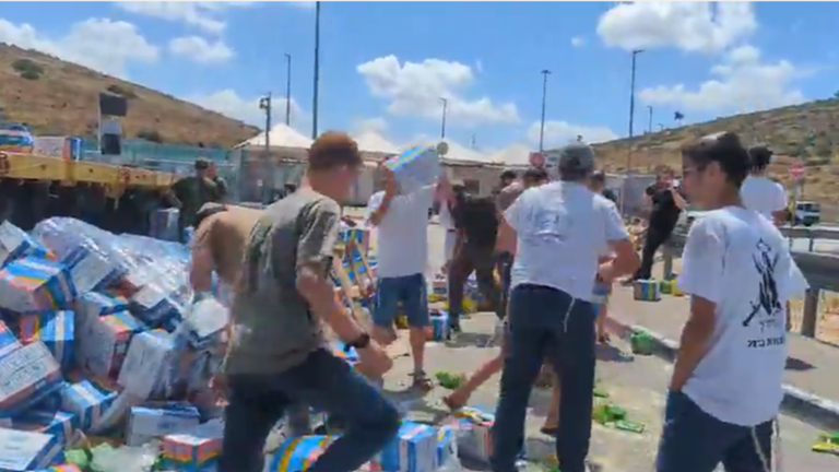 وأظهرت مقاطع فيديو نشرت على مواقع التواصل الاجتماعي، مستوطنون إسرائيليون يقطعون الطريق أمام قافلة مساعدات إنسانية كانت متجهة إلى القطاع، فيما قام آخرون بإتلاف المساعدات.