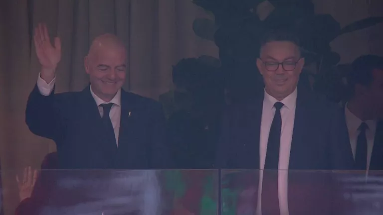 وظهر إنفانتينو في المقصورة الرئيسية لملعب مولاي عبد الله بالرباط، رفقة فوزي لقجع، رئيس الاتحاد المغربي لكرة القدم.